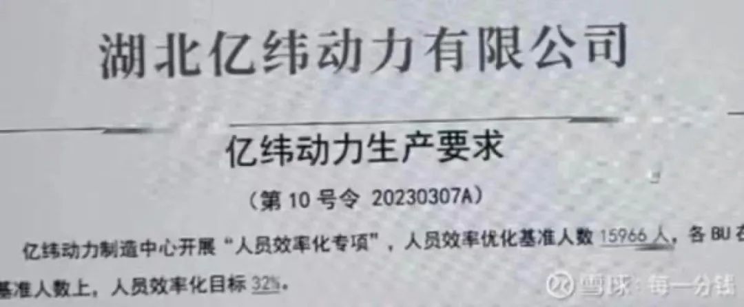 根据亿纬锂能子公司湖北亿纬动力有限公司的这份文件,亿纬动力制造中心将开展“人员效率化专项”行动,“人员效率优化基准人数15966人,各BU在此基准人数上,人员效率化目标32%。”