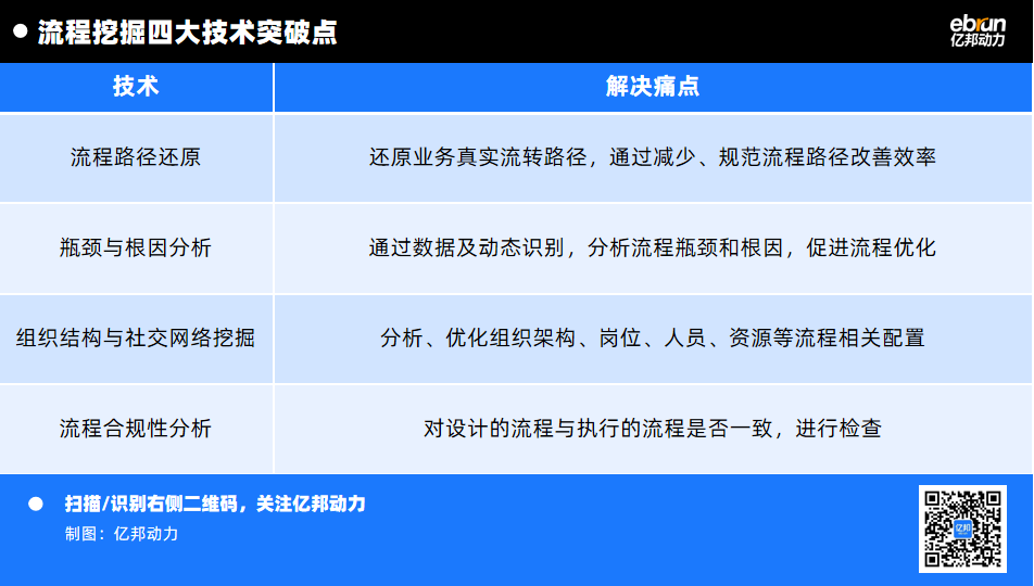 而流程挖掘的优势就在于,针对流程路径还原、瓶颈与根因分析、组织结构与社交网络挖掘,以及流程合规性分析四个方面,实现了技术突破。
