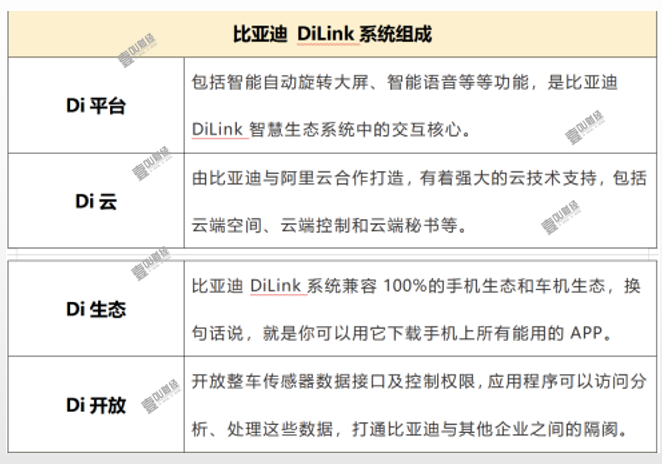 作为整车厂,比亚迪在智能网联和自动驾驶方面的两款自研产品——DiLink智能网联系统和DiPilot驾驶辅助系统。比亚迪的DiLink智能网联系统在2018年首推,包含Di平台、Di云、Di生态和Di开放四个部分,目前已经迭代到了4.0版本。