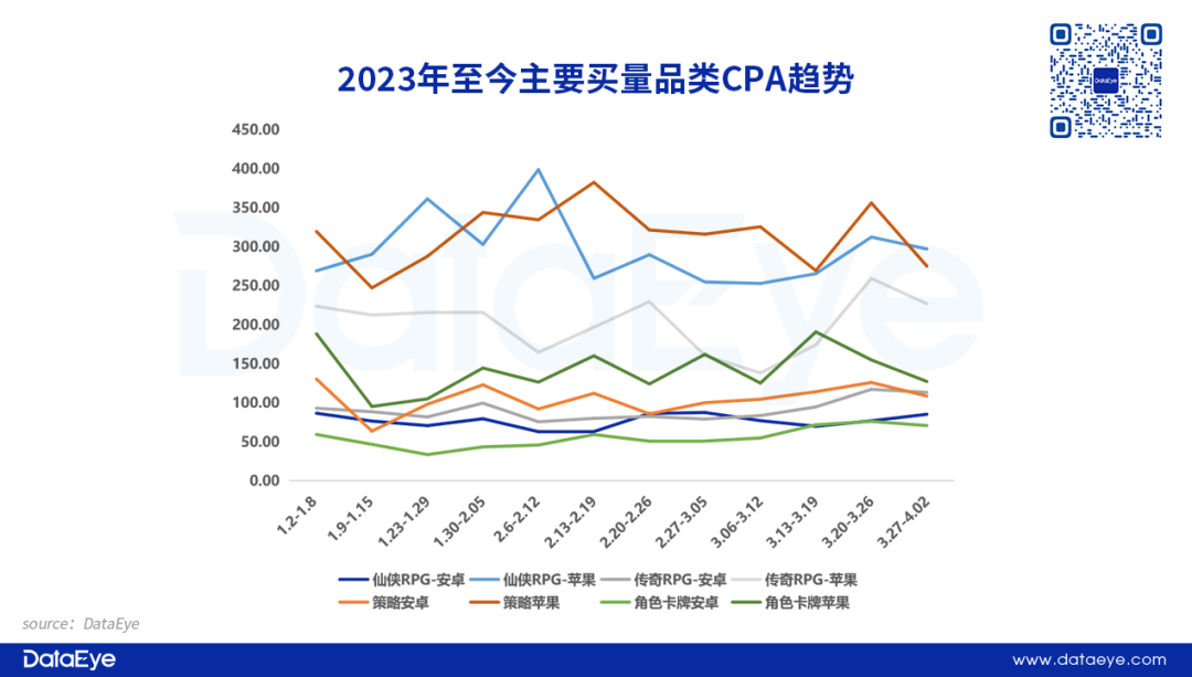 DataEye研究院从一家买量投放代理获悉:进入4月,买量价格维持高位,一些赛道(如传奇)价格飙升幅度较大。主要是因为游戏市场开始复苏,并且部分厂商(特别是小游戏厂商)已经开始备战五一长假期,推高了价格。以下为DataEye研究院对部分赛道买量CPA的价格预估数据。