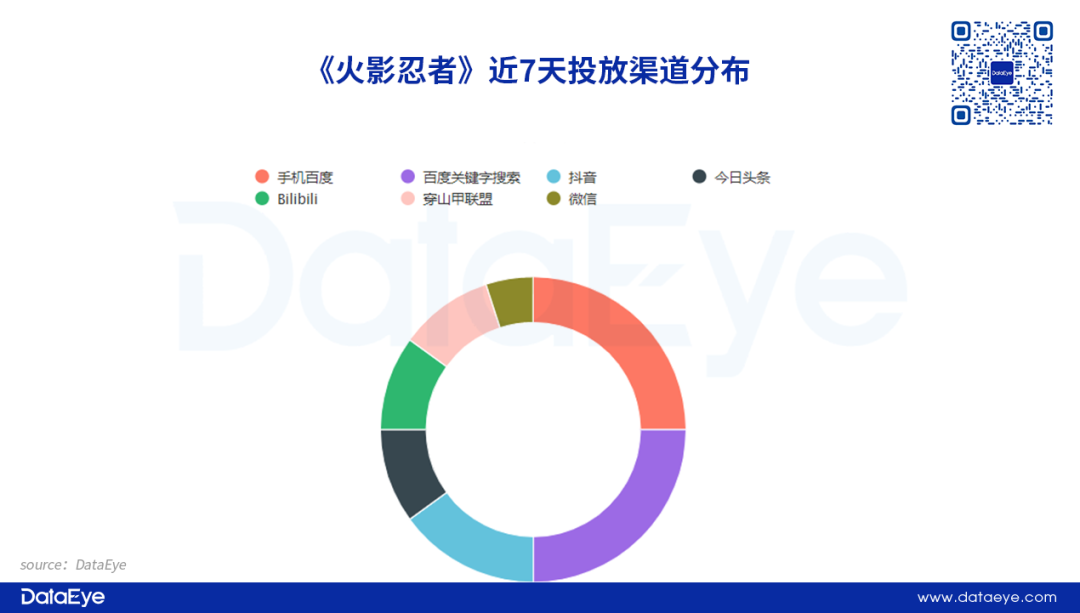 不只是《重返帝国》,DataEye-ADX数据显示,近7天《火影忍者》在素材投放渠道分布上,抖音渠道占比约15%,排名第三,位列第四的是今日头条。