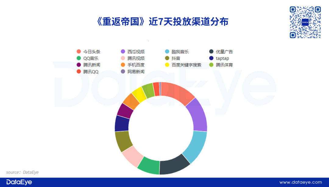 DataEye-ADX数据显示,《重返帝国》已开始在今日头条、西瓜视频上进行效果广告投放,这两个平台是近七天(4月3号—10号)该游戏素材量投放占比最高的两大渠道。