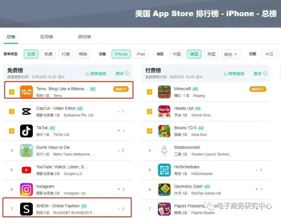 数据显示,截止2023年3月,苹果App Store上下载最多的三个免费应用程序是Temu、CapCut(TikTok视频编辑器)和TikTok;Google Play商店中下载最多是Temu、TikTok和Shein。