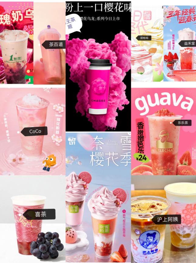 据壹览商业不完全统计,这个春天,16家茶饮品牌中就有11家推出了主打春日主题的粉红色系饮品。
