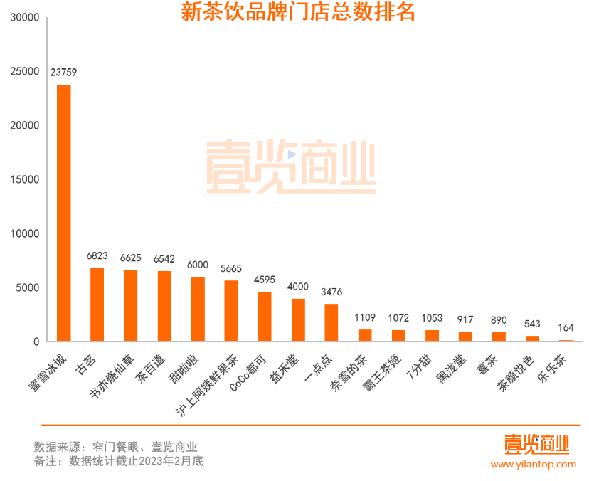 最后,以行业视角看,茶饮行业竞争激烈,时令新品的稳定高效推新,是除了门店规模竞争之外的重要翻盘筹码。如今,茶饮行业以门店规模牵引为表现的竞争愈演愈烈。奈雪的茶发展近10年才千家门店,但2023年计划开店600家;甜啦啦、古茗、沪上阿姨三大品牌则即将进入“万店之争”。据壹览商业不完全统计,截至2023年2月底,除蜜雪冰城以万店规模断层领先外,5000+门店规模品牌有5家、3000+门店规模品牌3家、千家左右门店规模有7家。显然,若要规模之外突破行业内卷,新品推出速度及能力成了一大重点。