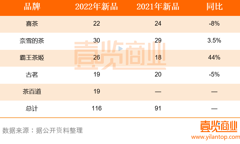 据各大茶饮品牌在公众号发布的新品看,2022年喜茶、奈雪的茶、霸王茶姬分别推出新品22款、30款、26款,3家千店规模左右的品牌,在新品研发效率上不输6000+门店规模的古茗与茶百道。这也是前3者在规模落后之下,但仍被定位“中高端”的底气之一。