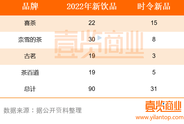 在壹览商业看来,对于新茶饮来说,好的季节限定不仅能带来流量,更是实打实的销量。正是因为看到了时令性产品的爆发力,越来越多的新茶饮品牌加入到时令茶饮的大军。据壹览商业不完全统计,喜茶、奈雪的茶、古茗、茶百道品牌在2022年共计推出90款饮品,其中以时令推出的新品(即命名含春夏秋冬、月、当季、回归等字样)数量高达31款,占比达1/3。