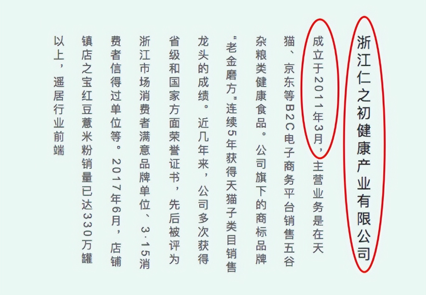 此外,老金磨方官网上还有一处错误,就是他们首页显示浙江仁之初健康产业有限公司成立于2011年3月,其实这是杭州老金食品有限公司成立的日期,而前者的成立时间是2016年5月15日。