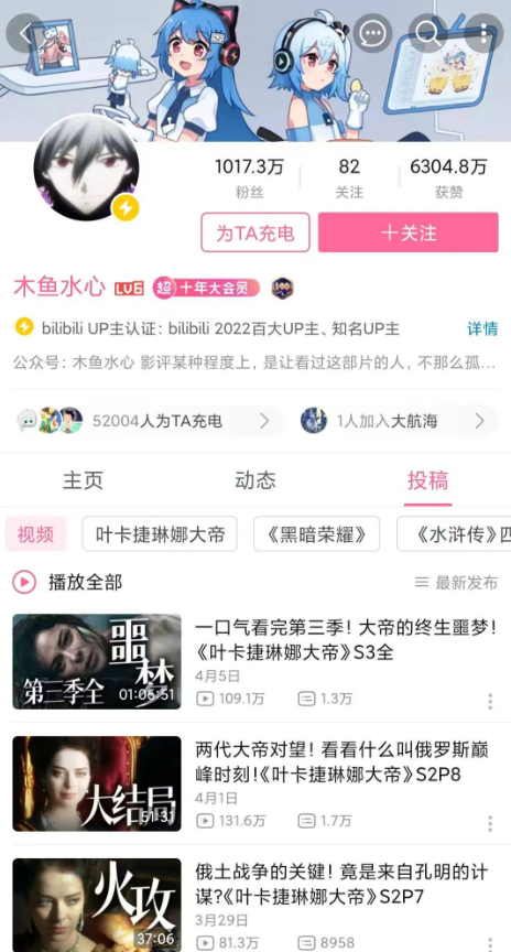 B站去年Q4财报显示,平台月均活跃UP主达380万,其中不乏影视二创UP主,比如有1000多万粉丝的“木鱼水心”、620多万粉丝的“三代鹿人”、620多万粉丝的“小片片说大片”、550多万粉丝的“阿斗归来了”,他们的单条视频往往有几十万甚至百万播放量,其中,“木鱼水心”“小片片说大片”曾多次登上B站百大UP主名单。