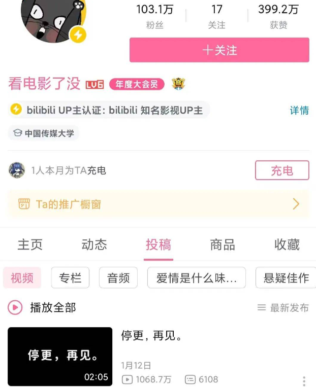 B站近期还遭遇了UP主“停更潮”,其中就有影视类UP主,比如有260多万粉丝的悬疑推理剧解说博主“怪异君”,还有103.1万粉丝的“看电影了没”,后者在1月就已停更。