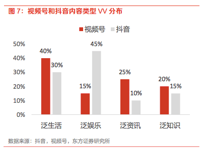 东方证券今年2月发布的《腾讯视频号深度报告:信息流广告变现稳步推进,严肃向内容引领差异化增长》显示,视频号内容沿袭了公众号风格,偏严肃向、专业化,同时用户端因处于微信社交体系内,为立人设,其更偏好泛生活内容,该类型视频的播放次数占比40%,而泛娱乐类型只有15%,远低于抖音的45%。