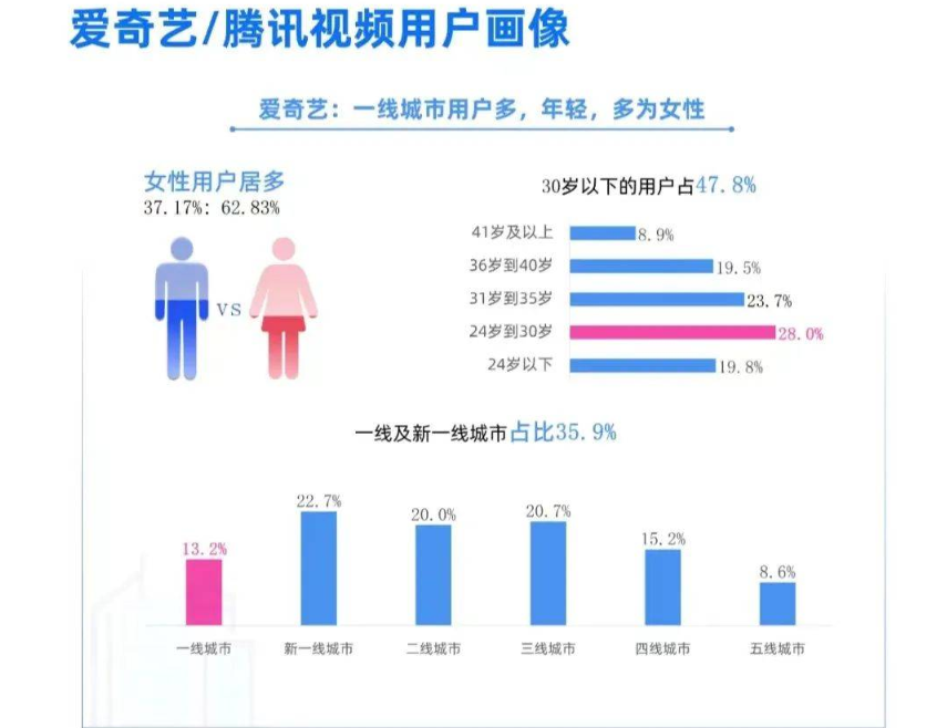 而在用户画像方面,AppGrowing去年8月的数据显示,爱奇艺、腾讯视频的用户在一二线城市占比分别为55.9%和58.3%,主要年龄段是24-40岁,占比分别为71.2%和72.2%。