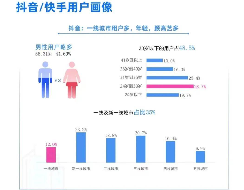抖音与之高度契合,其24-40岁用户占比70.3%,一二线城市占比53.8%;而快手用户则是年龄段契合,24-40岁占比72.7%,但城市分布有所出入,其一二线城市占比44.5%,下沉市场的占比反而更大。
