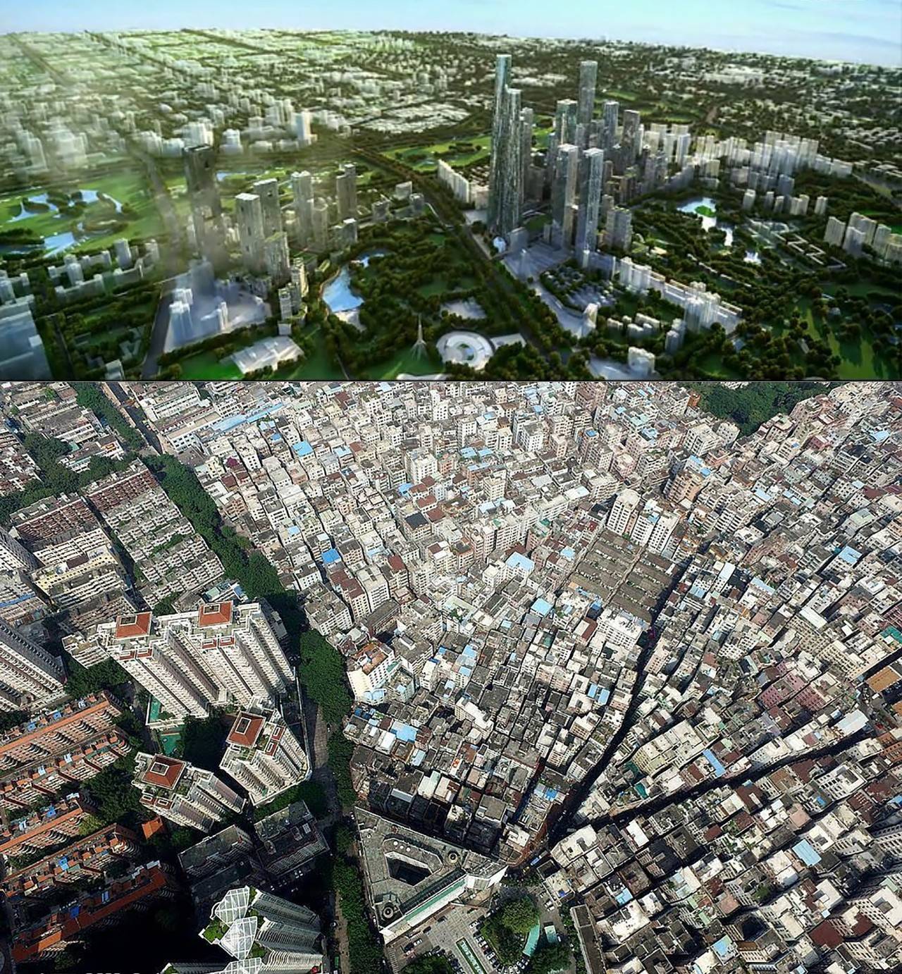 (上面是深圳白石洲旧改后效果图,而下面是旧改前密密麻麻的握手楼。)