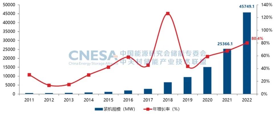《储能产业研究白皮书2023》显示,截至2022年底,我国已投运电力储能项目累计装机规模59.8GW,已经占到了全球市场总规模的25%,年增长率38%。