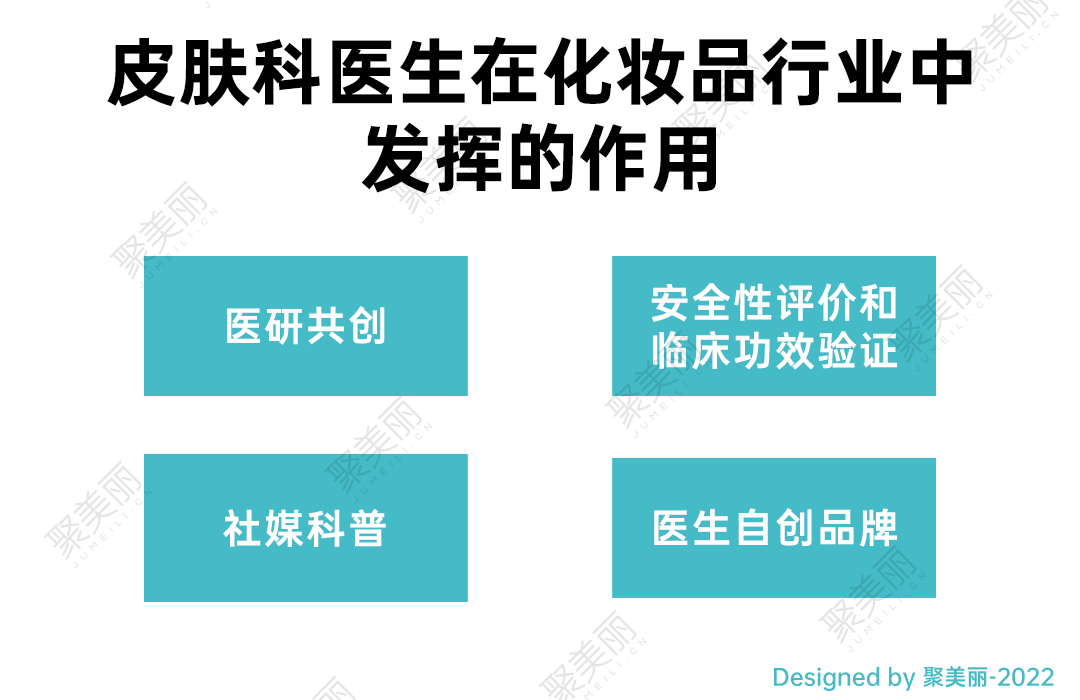 从化妆品产业链以及品牌和医生的合作形式出发,我们大致可以把皮肤科医生起到的作用分为4类:一是医生与品牌合作,进行医研共创;二是品牌基于医生或医院,做产品的安全性评测和临床功效验证;三是医生以自媒体平台进行护肤知识的科普,做产品的市场监测;四是医生自创化妆品品牌。