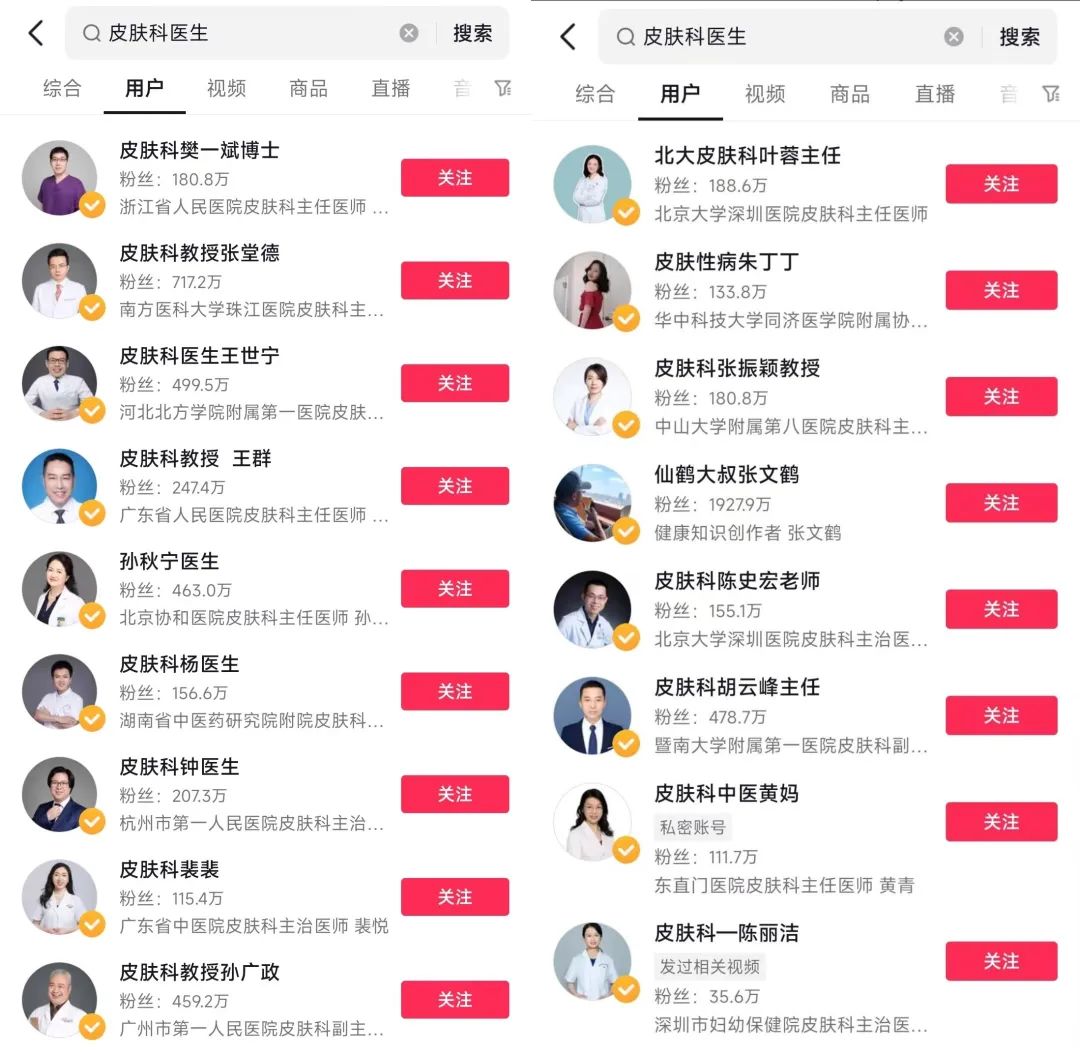 以抖音平台为例,以“皮肤科医生”为关键词进行搜索用户,拥有100w以上粉丝的皮肤科医生不在少数,包括像“皮肤科教授张堂德”、“皮肤科医生王世宁”、“孙秋宁医生”、“皮肤科钟医生”、“皮肤科樊一斌博士”、“皮肤科潘卫利教授”等账号。