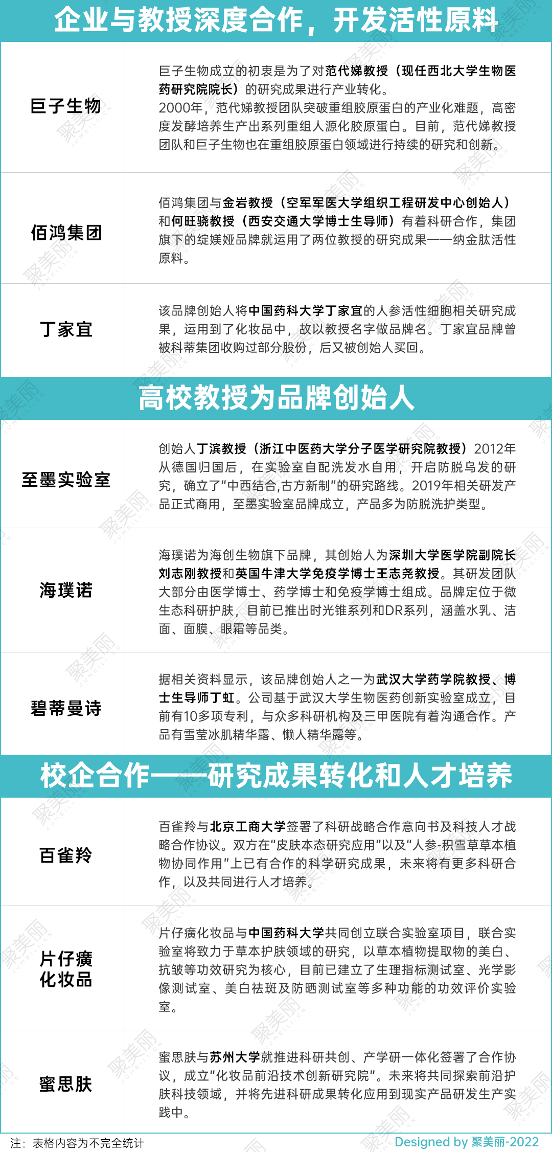 上图中列举的仅是近期的行业合作动态,除此之外,如暨源生物和暨南大学共同组建的暨南大学肽源化妆品创新研究院、膜法世家与贵州医科大学携手打造天然药用植物功效开发与化妆品应用联合实验室等都是校企合作的案例之一。
