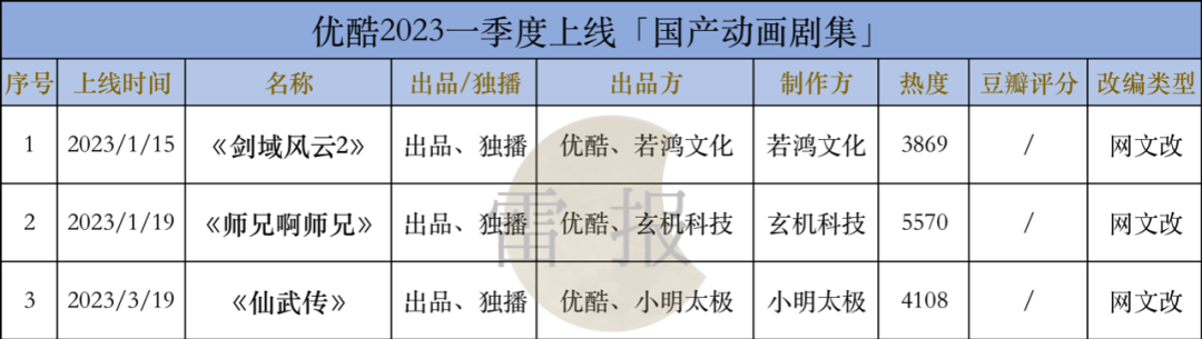优酷于一季度重磅上线了3部国产动画,且都参与了出品,在优酷进行独播。