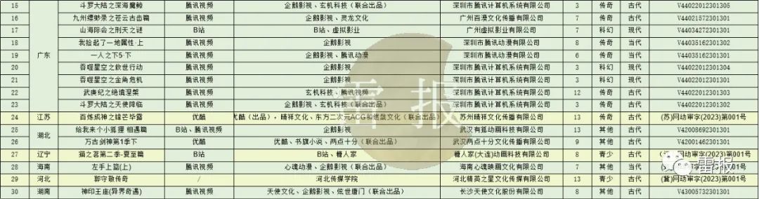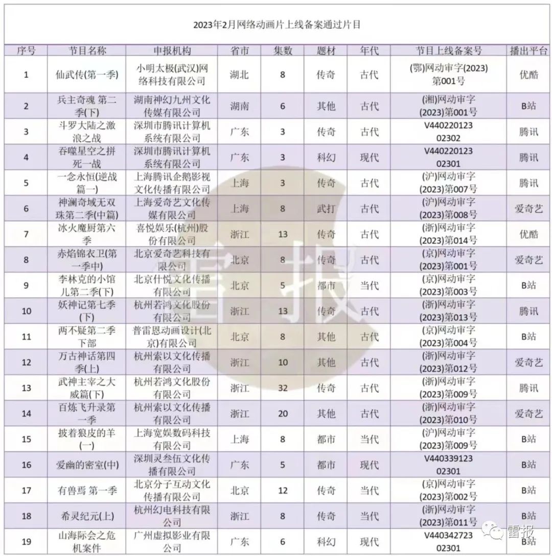 平台新上线动画和备案情况息息相关,除了在整个第一季度的网络动画上线备案通过片目中能看到以上这些新片的身影,此外总的来看,一季度上线备案通过“网络动画”有85部(1月30部、2月19部、3月36部;注:不少动画被拆分为几部分进行备案,这里的1部部分不是指一整部作品)。而其中,腾讯系公司直接申报约21部、B站13部、爱奇艺6部,优酷不少作品由制作方等公司进行申报。