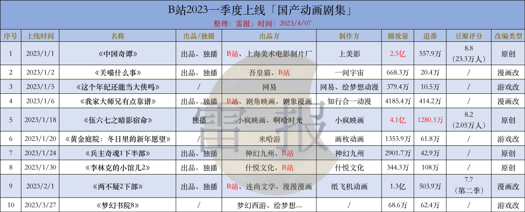 B站:一季度6部出品作品上线,《伍六七》播放量超4亿、《中国奇谭》2.5亿