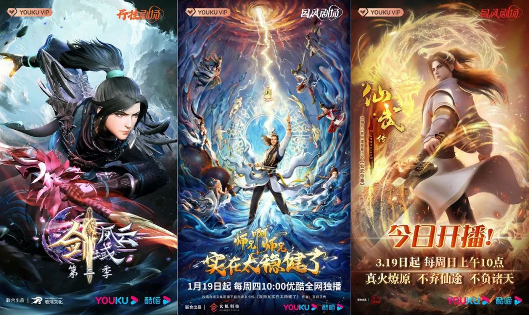 《仙武传》也是平台的高热度国产动画作品,由优酷和小明太极出品,小明太极制作,改编自六界三道小说《仙武帝尊》,作品来自于塔读。另外从剧场来看,3部中1部为“开挂”,2部为“国风”。