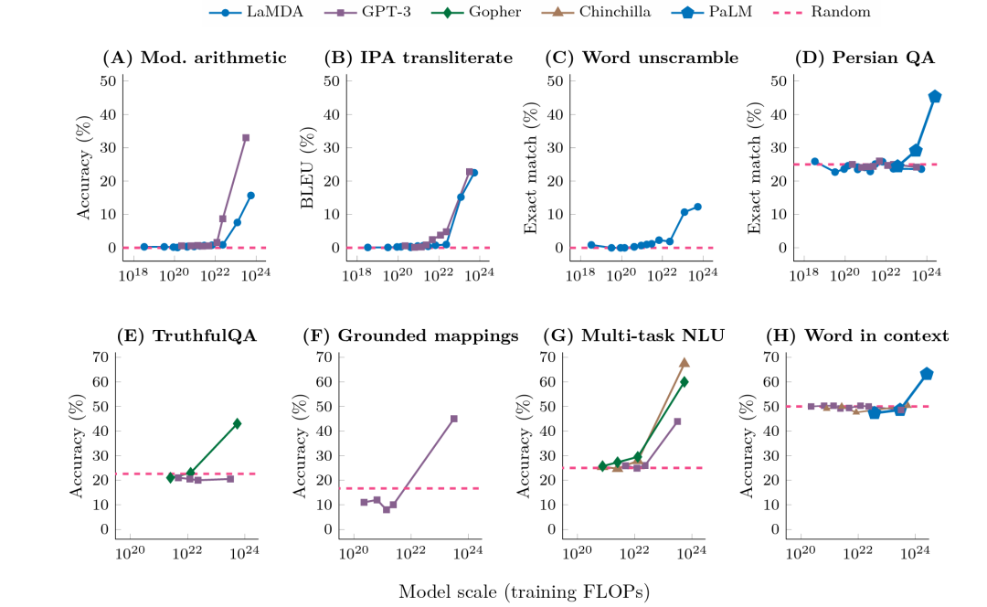 大语言模型的涌现现象,在一定规模后迅速涌现出新能力;图片来源:Google、Stanford、DeepMind:Emergent Abilities of Large Language Models