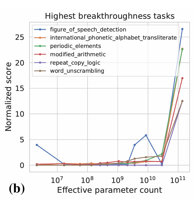 在上一步的基础上,第二类就是涌现出新能力。具体体现为,在模型参数规模不够大时,AI的能力表现非常一般,准确性几乎是随机的。但是当模型规模和计算力都推进到一定规模之后,AI的能力突然急剧增长。经过分析,这类能力也有一个共性,就是这类任务都是由多个步骤构成的一个复杂任务,比如语词检测、国际音标音译、周期性运算、修正算术、单词解读等等。