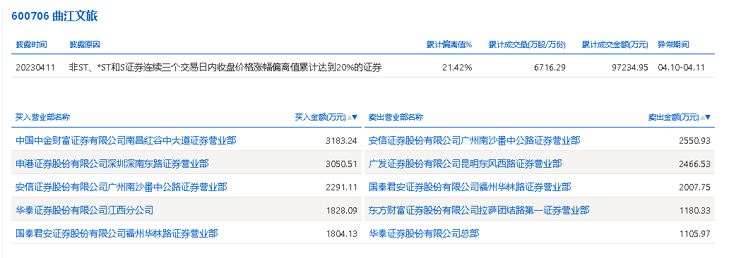 4月11日,曲江文旅今日再度涨停,录得2连板,龙虎榜数据显示,4月10日至4月11日期间,上榜营业部席位合计成交2.15亿元,其中买入金额为1.22亿元,卖出金额为9311.51万元,合计净买入2845.57万元。