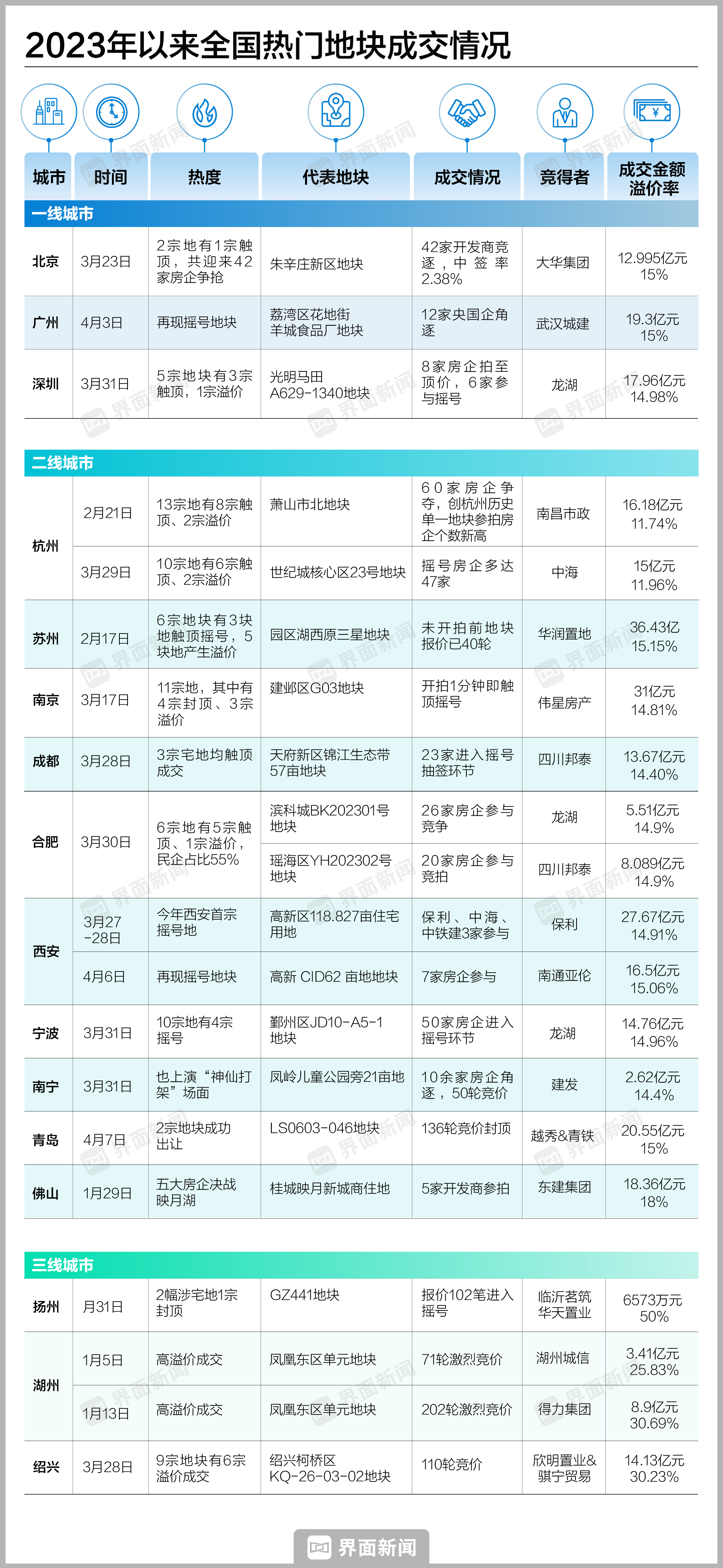 进入2023年以来,随着经济预期好转,全国楼市活跃度提升,土拍也随之升温,以北京、广州、杭州、南京、成都为代表的多个城市多数地块竞争激烈,部分地块的房企报名数甚至创历史新高。