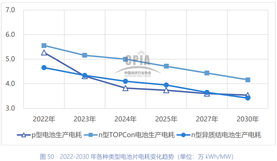 根据《中国光伏产业发展路线图(2022-2023 年)》统计,以工厂生产电池片产品所耗用的全部电力(不包含办公区域及生活用电)测算,2022 年,全行业的n 型 TOPCon 电池片平均电耗约 5.6 万 kWh/MW。