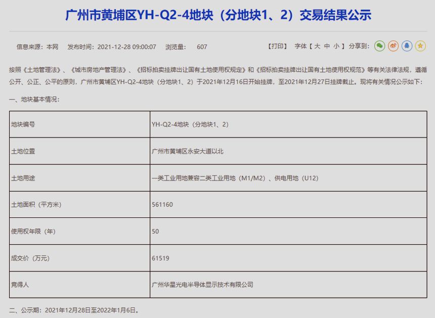 2021年12月28日,广州发布《广州市黄埔区YH-Q2-4地块(分地块1、2)交易结果公示》:广州华星光电半导体显示技术有限公司以底价61519.00万元竞得YH-Q2-4(分地块1、2)地块,楼面价仅为280元/㎡。