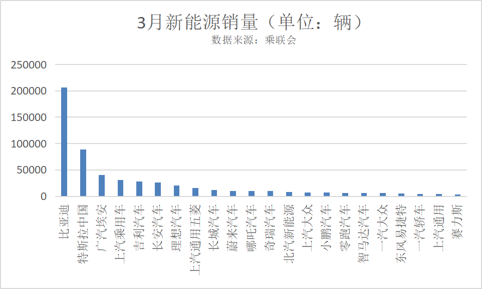 根据乘联会数据显示,刚刚过去的3月,除了比亚迪之外,新能源汽车销量排行榜上,特斯拉依旧以7.7万量的销量遥遥领先一众品牌。