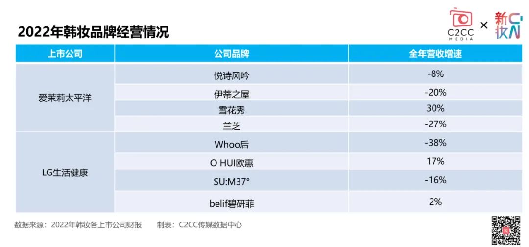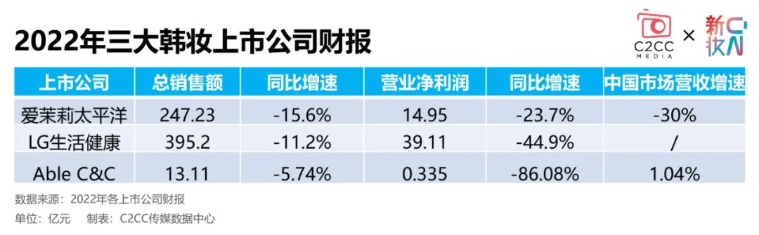 竞争对手LG生活健康的财报数据也不容乐观,2022全年售额为71858亿韩元(约合人民币395.2亿元),同比下降11.2%,营业利润为7111亿韩元(约合人民币39.11亿元),同比下降44.9%,十八年来首次出现业绩下滑;