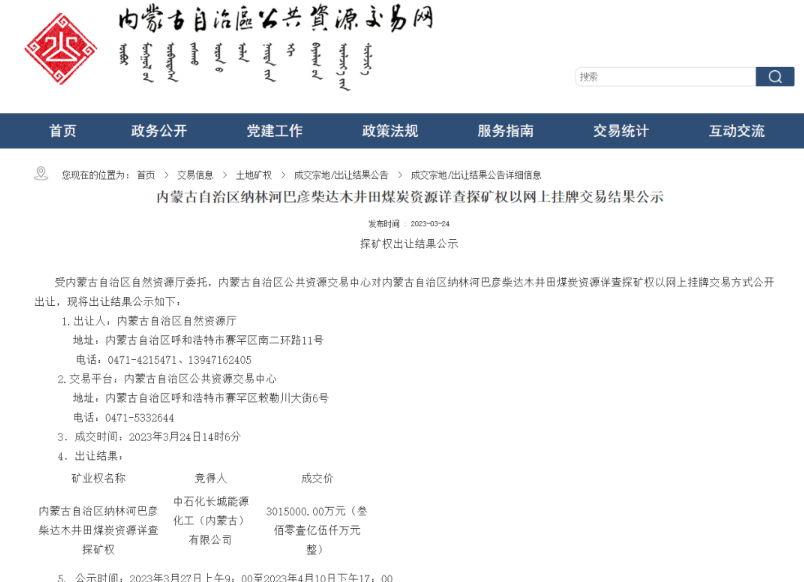 据内蒙古自治区公共资源交易网公示信息,经过386轮限时竞价,中石化长城能源化工(内蒙古)有限公司(下称内蒙古长城能化)以301.5亿元竞得内蒙古自治区纳林河巴彦柴达木井田煤炭探矿权。