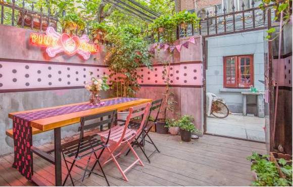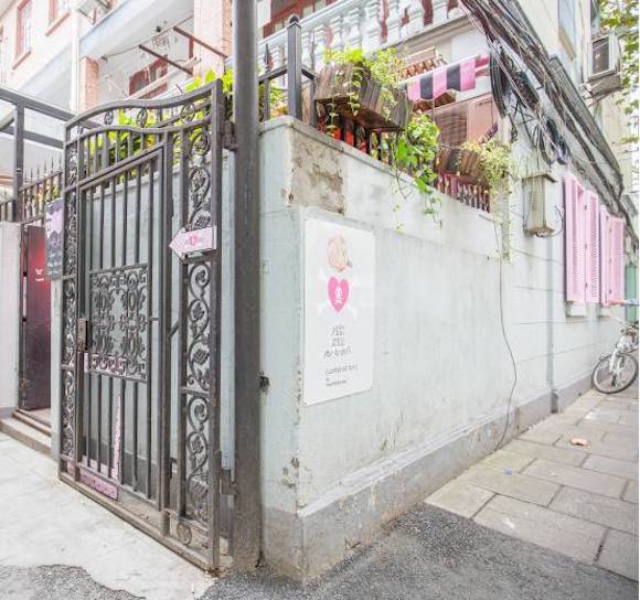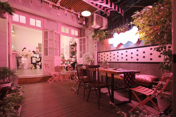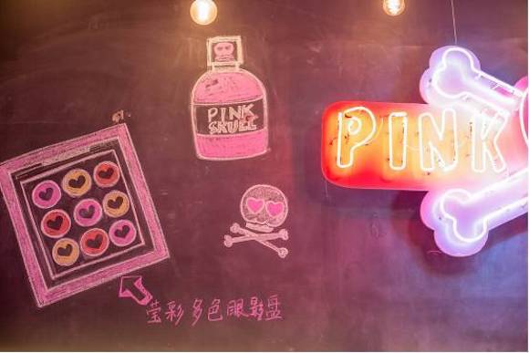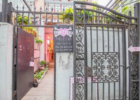 这家叫作Pink Skull Pop-up Cafe(粉红骷髅快闪咖啡馆)开在襄阳北路临街的公房小区一楼,一拐进襄阳北路就能看见两扇大大的粉色窗户,它们半敞着,挂着大大的宣传牌。而沿着窗户走,先走过粉黑条纹做成的雨棚,再穿过一个小院子,走进不大的咖啡馆内,一路上看到的粉色骷髅霓虹灯、各种粉色的装饰物,被布置成粉色化妆台的小吧台,黑板墙上画着的化妆品图样,还有粉色的桌子、椅子、门,给人以连续不断的视觉冲击。你甚至可能会感叹一句,“这里竟然还有粉红色。”