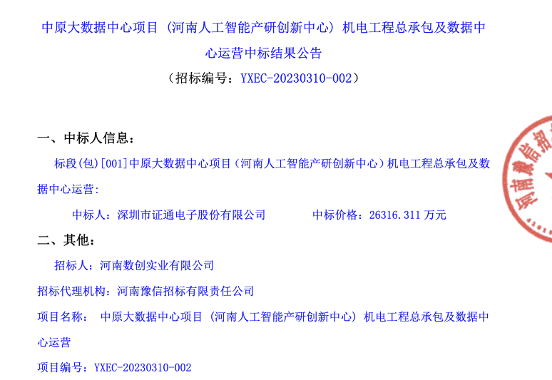 4月12日,据河南省电子招标投标公共服务平台公告,证通电子中标中原大数据中心项目(河南人工智能产研创新中心)机电工程总承包及数据中心运营标段(包)[001],中标价约2.63亿元。