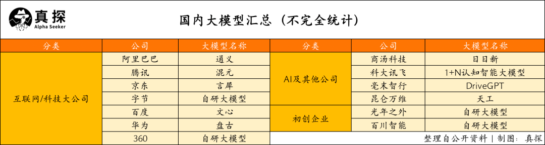 ChatGPT在全球掀起热潮以来,国内已有多家公司发布或将发布自己的大模型,这些公司中既有阿里巴巴、百度、京东、华为等互联网或科技大厂,也有以商汤为代表的AI公司,以及备受瞩目的初创企业(例如王慧文的光年之外,王小川的百川智能)。