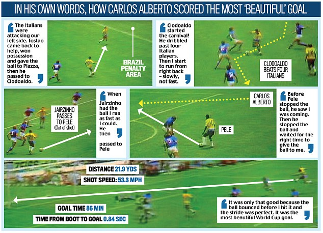 在阿尔贝托职业生涯的21座冠军奖杯中,分量最重的无疑是1970年的世界杯冠军。在阿兹台克球场同意大利的决赛中,桑巴军团从后场开始进行了连续20多次的不间断传球,直到禁区前沿。最终,贝利在弧顶处分球助攻,右侧插上的阿尔贝托外脚背大力抽射破门,打进了巴西队在那场比赛的第4球,这也被外界看作是世界杯历史上最为精彩的团队进球。