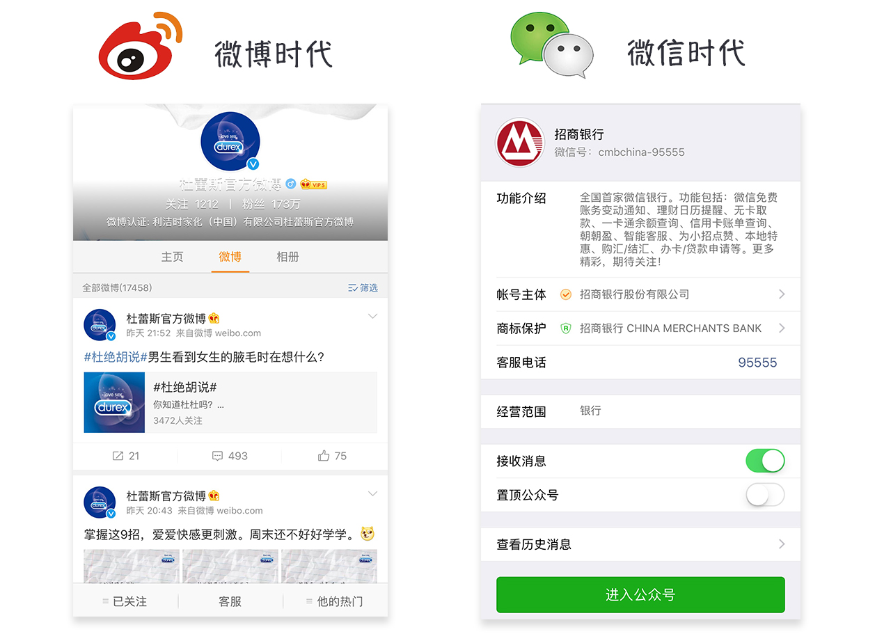 微博时代火了杜蕾斯;而在微信时代,第一家“提出服务即营销”,推出“微信银行”的招商银行,也在推出1个月内获得200万信用卡绑定用户。对于失去先机的其他账号,这是事倍功半都难以获得的效果。