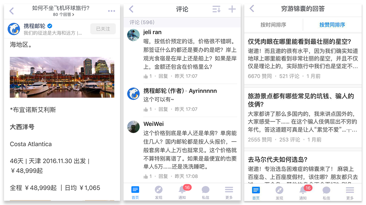 @携程邮轮和@穷游锦囊紧抓旅游热门领域,在回答 「乘坐豪华游轮是一种什么体验」等大众愿望时,即使文末带转化,也有几百号人来评论询价。