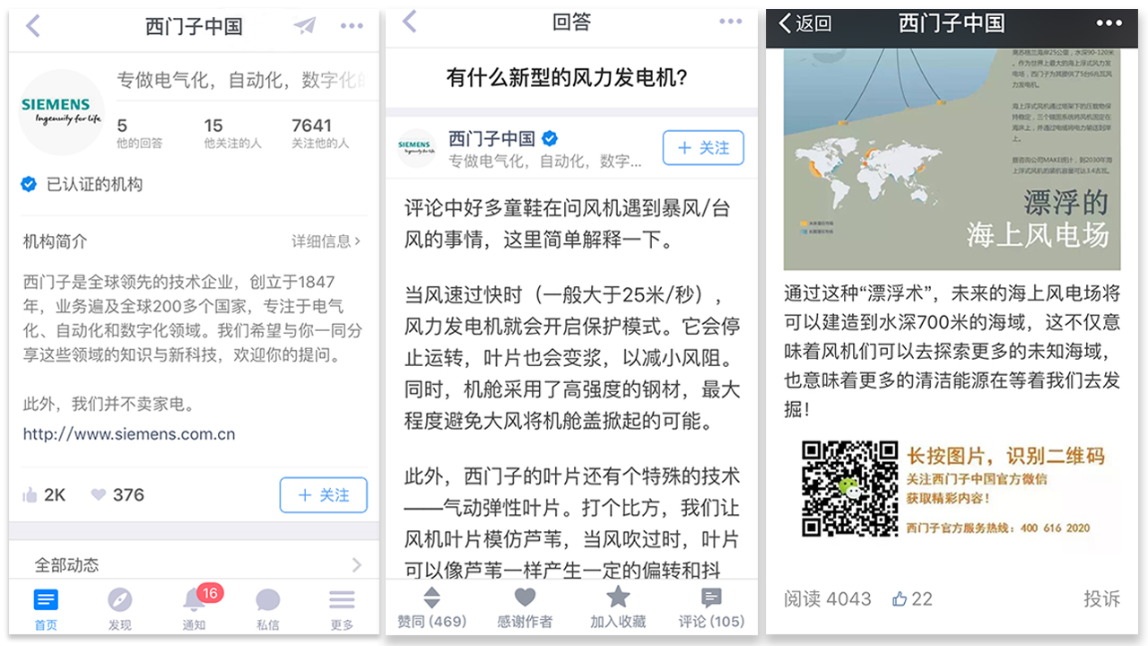 @西门子中国开腔谈黑科技。谈起风力发电机,在微信上只能获得4千阅读量和20多个赞,而在知乎上却有2万8千关注,和100多个评论,还引起了深入探讨。