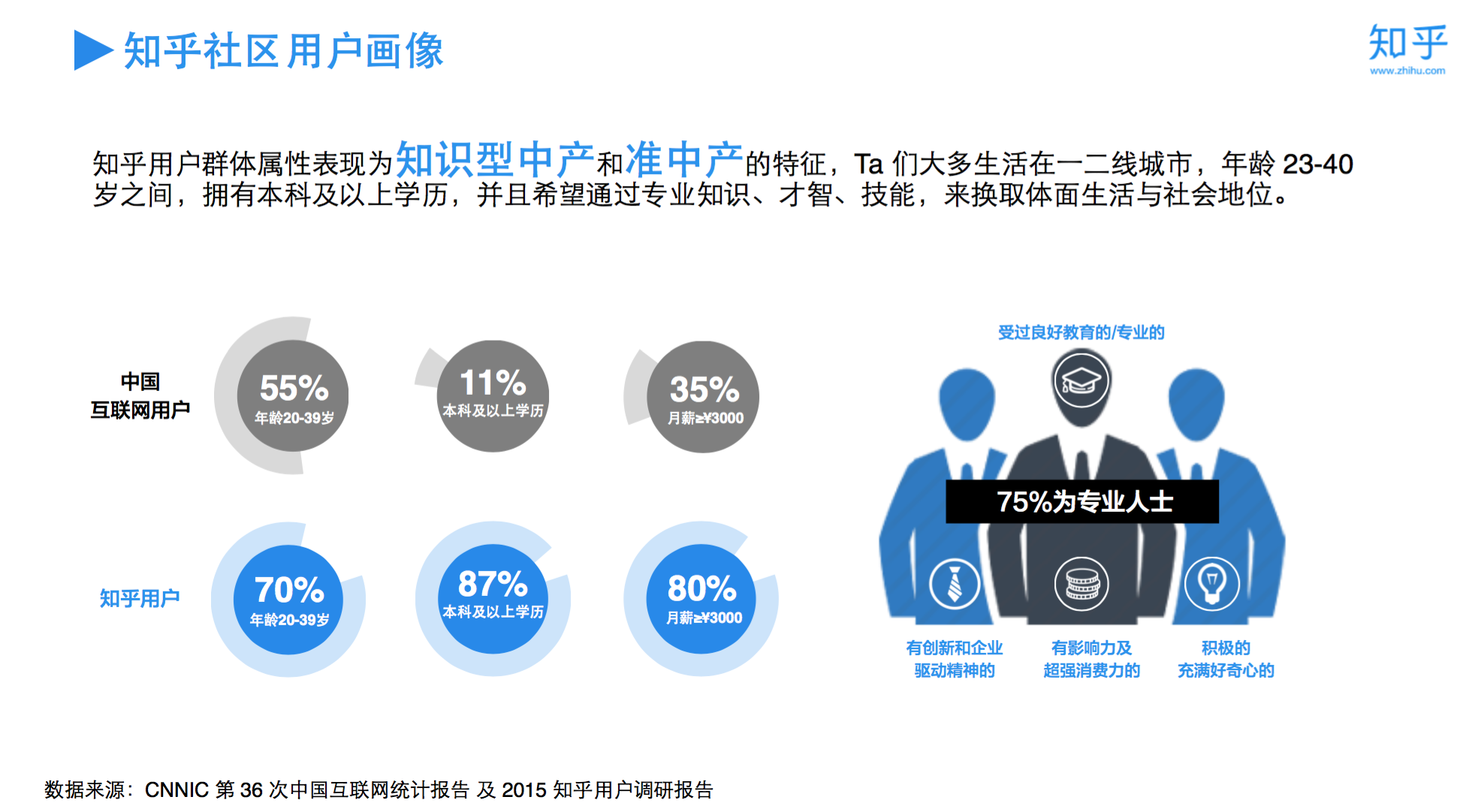 知乎坐拥5000万注册用户,1300万日活跃用户,量级上比微博少一个零头,但它凝聚的却是全国网民中较为优质的那一拨: