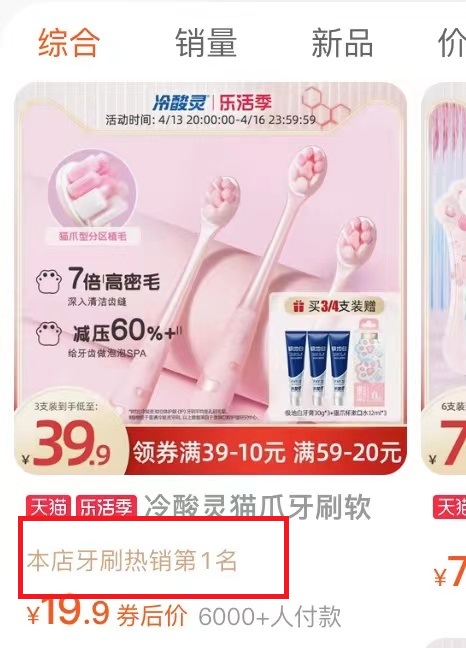 而去年腾格尔和冷酸灵合作的这款牙刷,也一直热度不降,淘宝官方旗舰单只猫爪牙刷价格平均24.9元一只,价格并不低廉,但根据2023年4月淘宝数据,淘宝官方旗舰本月销售量已经6000+,总销售量也已经达数万,它的热度和购买率一直稳居官方旗舰销售额第一名。