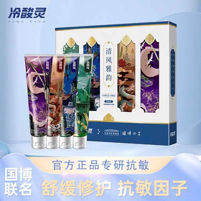 其实冷酸灵也不止这一次成功的营销,还有之前的各种联名包装,比如联合中国国家博物馆推出系列牙膏,从商朝后母戊鼎、汉代击鼓说唱陶俑、明代青花竹石芭蕉纹梅瓶、郑板桥华封三祝图轴、乾隆霁青金彩海晏河清尊文物中汲取设计灵感,打造了五款国博潮新款牙膏,借文化IP提升品牌内涵,也是一次打造年轻潮流形象的营销过程。