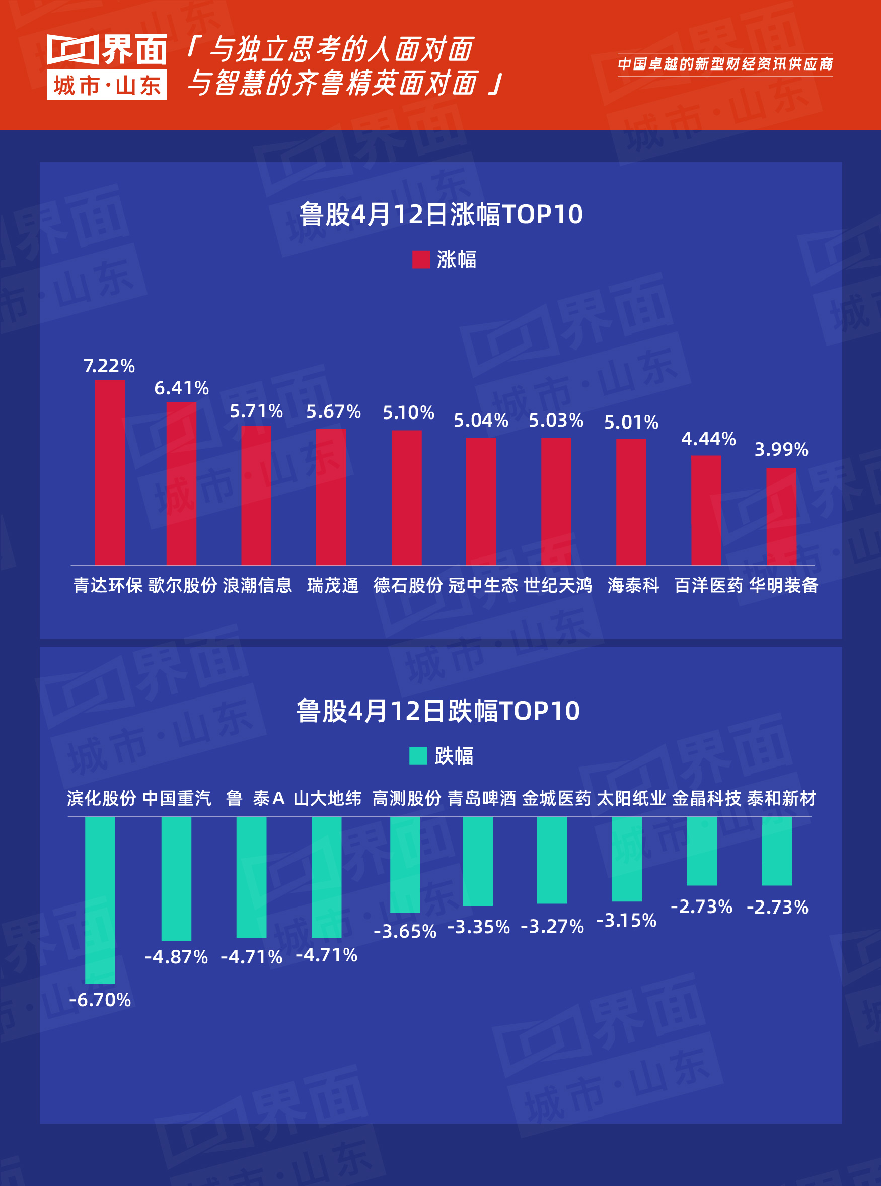 4月12日,山东省内沪深股票有167只个股上涨,113只个股下跌;总市值过千亿的有万华化学(600309)、海尔智家(600690)、兖州煤业(600188)、青岛啤酒(600600)、中航沈飞(600760)、山东黄金(600547)、潍柴动力(000338)共7家,500亿-1000亿的共有6家,分别是华鲁恒升(600426)、歌尔股份(002241)、浪潮信息(000977)、中际旭创(300308)、华熙生物(688363)、华电国际(600027)。