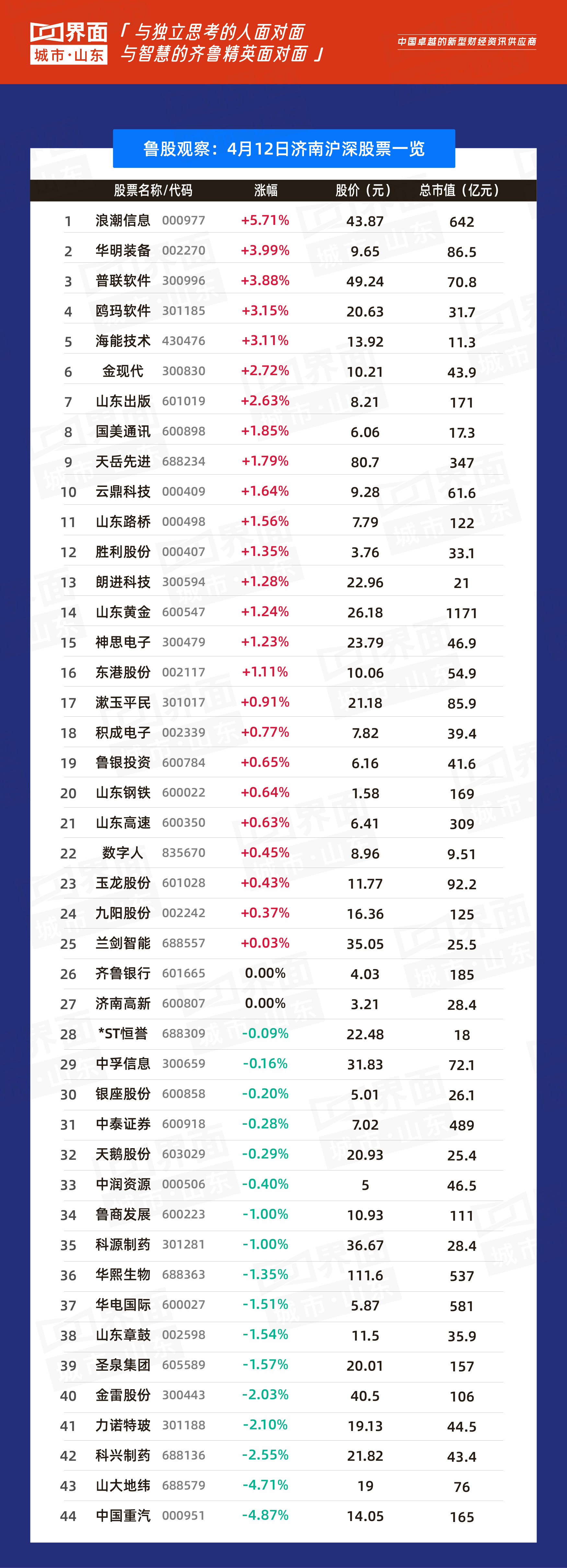 济南市涨幅榜首:浪潮信息(000977),涨幅5.71%,股价43.87元,总市值642亿元;