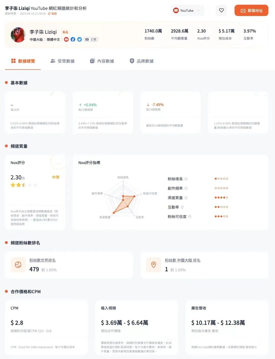 来自第三方营销平台Nox Influencer的数据显示,停更后,李子柒的YouTube频道渠道质量稳定在四星(总分为五星),区域CPM在10美元至18美元之间,预估其每月广告营收在10.17万美元至12.38万美元之间。