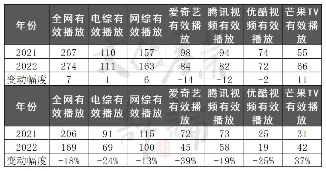 云合数据显示,2022年上新综艺数量增加了7部,但有效播放量下降了18%,台综(-24%)、网综(-13%)的表现与整个市场一致。网综平台方面,除了芒果TV上新数(+11)和有效播放量(+37%)上涨,爱优腾均在数量和播放量上出现下滑,芒果TV虽然“稀释”了整个网综市场效益下滑的幅度,但最终未能改变整体状况——数量微涨(+6)但有效播放量减少明显,市场效应显著下降。
