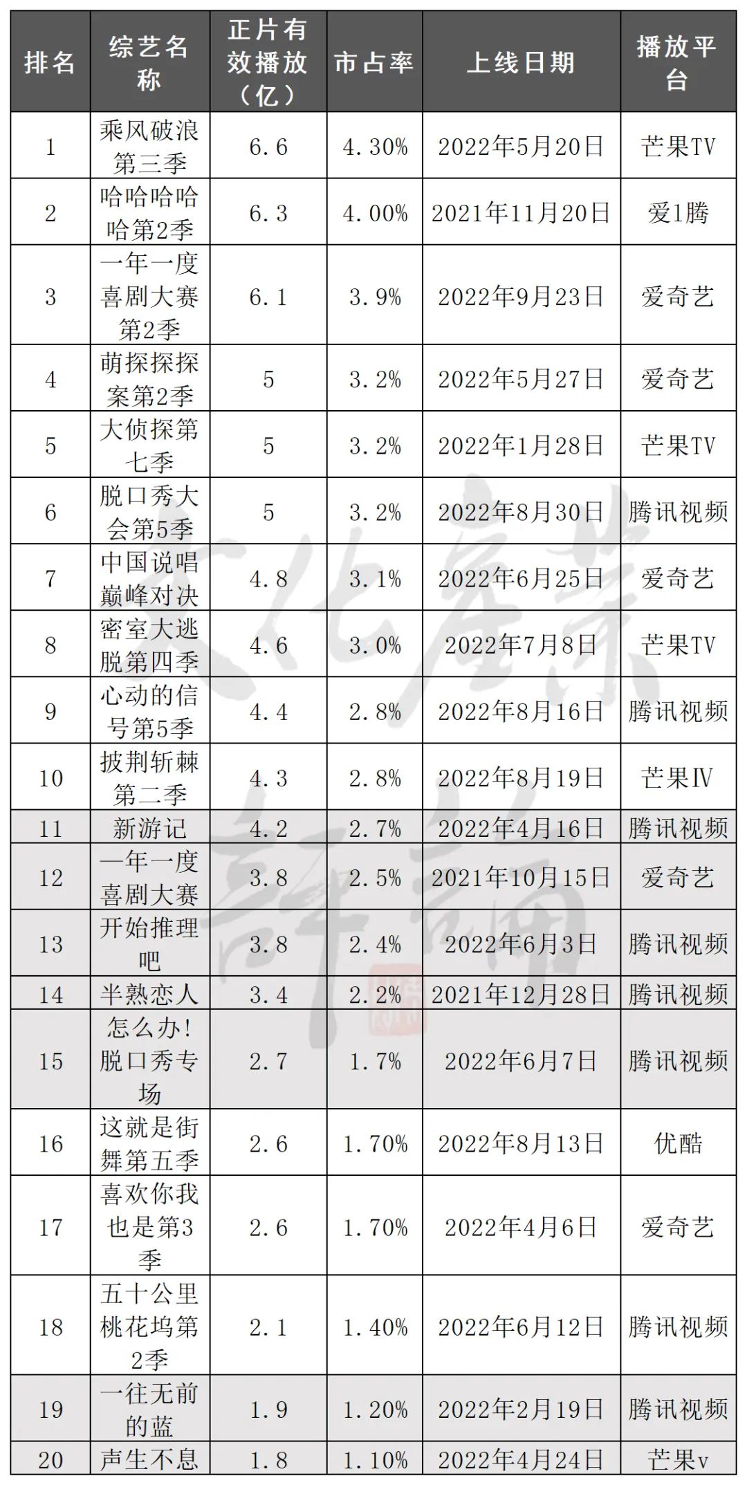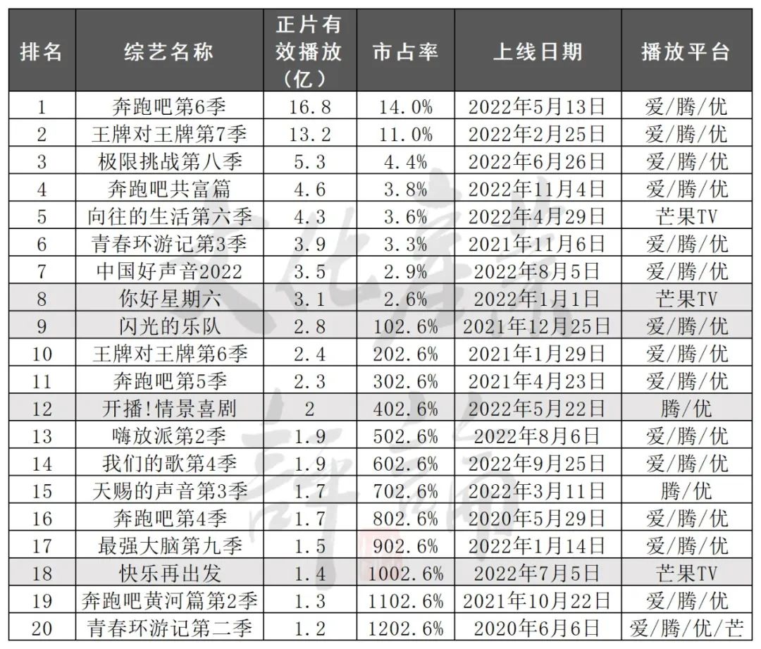 △2022网络综艺有效播放top20 数据来源:云合数据《2022年综艺网播表现及用户分析报告》 注明:涂色部分为原创综艺